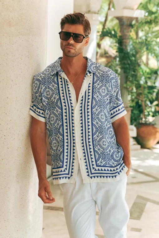 With a silky finish and mosaic inspired print, our Bodhi Shirt is a versatile piece to elevate your Euro summer wardrobe. – Relaxed fit- Short sleeves- Centre front button closure- Unlined, non-stretch- 50% Rayon u0026 50% Cotton Please refer to care label for garment care instructions. Colours may appear slightly different to the website due to lighting, computer picture resolution and monitor settings. Print placement may vary between each individual item. ~section~ – Length (Size L): 74cm/29inches. – If you need more help with sizing, see our size guide or email us at [email protected] ~section~ Gio wears a size L and is 188cm tall.