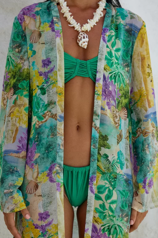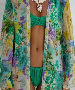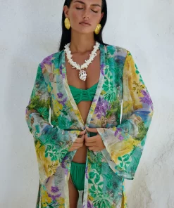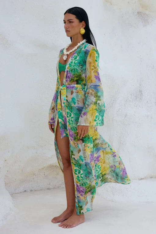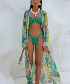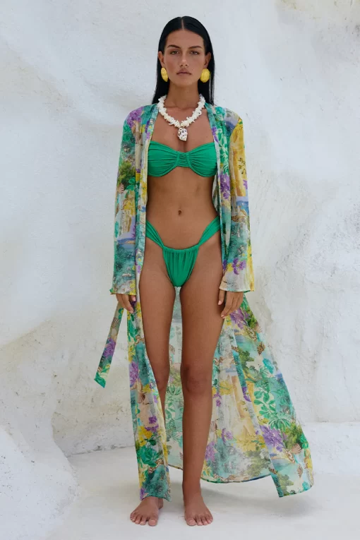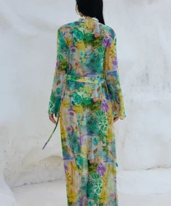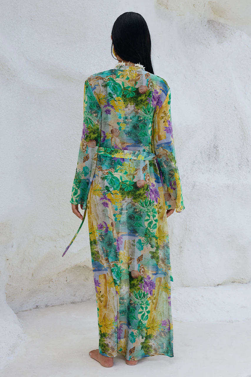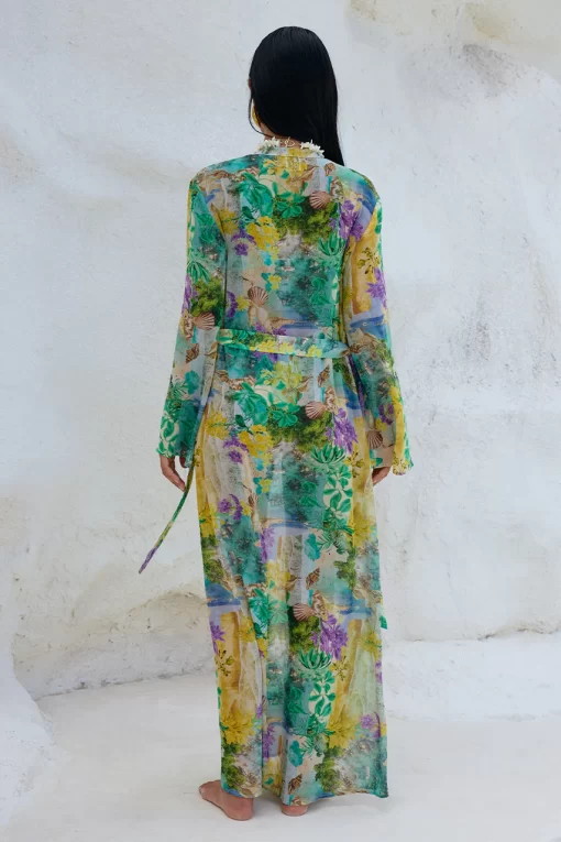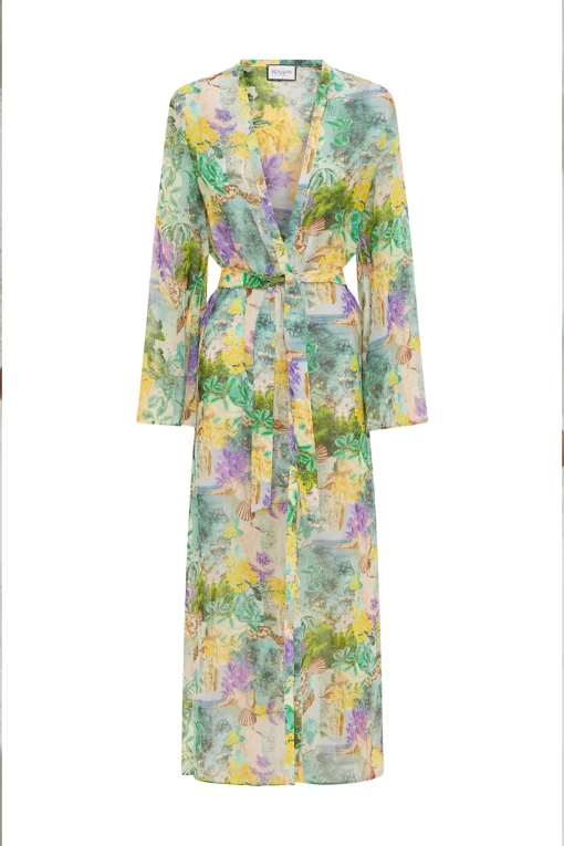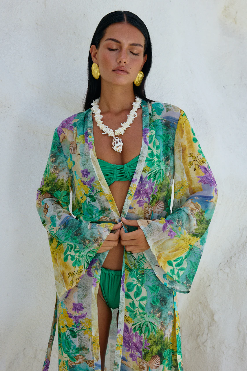 A classic robe style with an adjustable belt, our Camille Robe is the chic beach cover up you need this summer, match this with our Tropez Top and Tropez Bottom for the complete look. – Maxi length- Full length bell sleeves- Self tie belt with loops- Unlined without stretch- 100% Polyester Please refer to care label for garment care instructions. Colours may appear slightly different to the website due to lighting, computer picture resolution and monitor settings. Print placement may vary between each individual item. ~section~ – Length (Size S):143-145cm/56-57inches. – If you need more help with sizing, see our size guide or email us at [email protected] ~section~ Lente wears a size AU 6 / XS / US 2 and is 170cm tall.